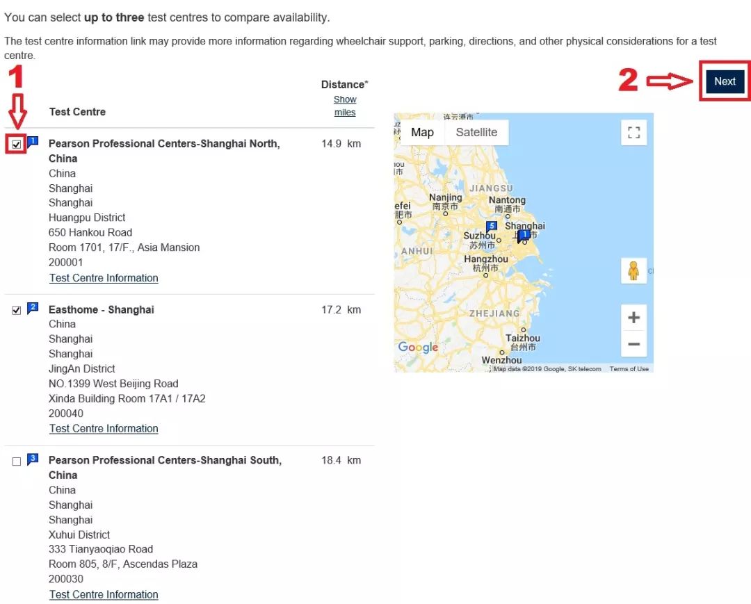 选择您希望参与考试的考点后点击Next,查看该考点可以提供考试的日期及时间(最多可同时查看三个考点)。