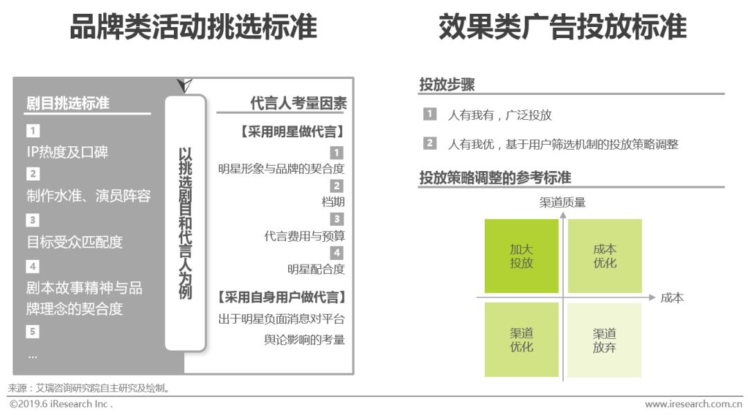 平台对于目标客群的筛选往往是多轮的,对于用户特征的挖掘往往是递进式循环进行的,反复的总结与迭代可以帮助平台动态了解其新用户是谁、在哪里,老用户又潜移默化地发生着哪些改变,可以帮助平台在合适的渠道、以更快的速度触达目标客群,可以帮助平台在恰当的时间、以预期可控的资金进行品牌营销,以实现较为理想的转化效果。 金融科技企业品牌类活动和效果类广告由于宣传目的的不同通常遵循不同的挑选标准。品牌类活动常以树立平台的品牌形象为主要目的,传播的广泛性、恰当性、节奏性尤为重要,因而活动热度、活动受众与平台目标用户的匹配程度、活动价值观与品牌主张的相符性等因素多是品牌类活动挑选的重要依据。相比之下,效果类广告的目的更为直接,效果类广告以短平快的效率和可衡量的结果为导向,因而需要综合渠道质量、渠道费用以及投放时间等因素不断地对投放策略进行有效调整,以提高获客精准度。