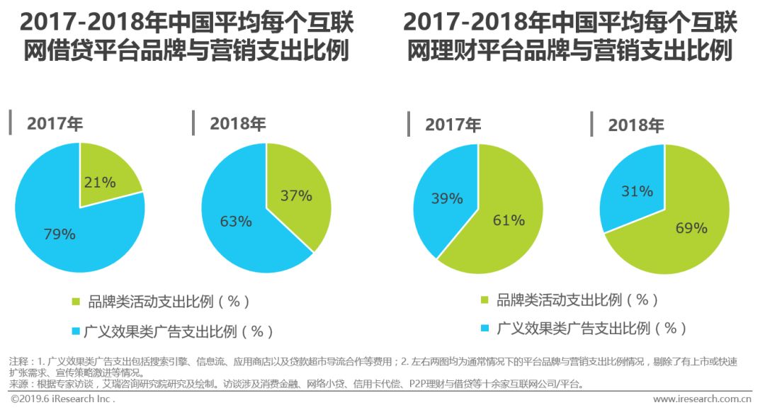 从支出流向来看,广义效果类广告(见注释)是互联网借贷平台的重头支出,近两年占品牌营销总支出的比例达6-7成;品牌类活动是互联网理财平台的重头支出,近两年占品牌营销总支出的比例同样达6成。 从事不同金融业务的互联网平台,其支出重心之所以截然相反,是因为:理财作为一项吸储业务,对用户信任感的需求程度相对更高,而信任感来自品牌背书;借贷作为一项放款业务,更多考验的是平台对风险用户的甄别能力,用户对贷款业务的感知则是侧重于能否更快、更多、更便宜的获得资金,因而如何更直接、更快速地实现获客供平台风控筛选是首要问题。 从时间来看,相较2017年,无论借贷平台还是理财平台均在2018年增加了品牌支出,平台们对形象塑造重视程度加深的背后进一步反映出白热化的同业角逐与用户争夺。在网贷行业暴雷和金融监管的施压下,部分平台的品牌活动主要集中在2018年Q3之前。