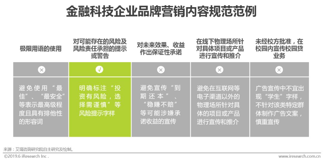 金融企业的品牌营销变化具体表现为:(1)内容上,对外宣传内容的规范性得到了愈发严格的管理;(2)形式上,从静态到动静结合,娱乐性、个性化与沉浸感被强调;(3)渠道上,从线上线下结合到被动深耕线上,线上偏爱娱乐与垂直渠道;(4)思维上,规模思维与效率思维的权衡。 金融品牌营销现状:借贷用户趋于年轻化、城市下沉,理财用户趋于大龄化;相较品牌活动,效果类广告对用户属性变化更为敏感;单个平台品牌营销总支出逐年增长,2017年达亿级;理财平台总支出通常情况下高于借贷平台;投入比例方面,借贷平台重效果,理财平台重品牌。效果衡量应结合结果导向指标与效率导向指标;组合各环节用户转化率,可帮助平台进行问题诊断与效果优化。趋势建议:群体规模大小不等于群体价值,垂直渠道待深耕;善用营销工具造血,用户激励贯穿用户转化全流程;注册成本高企,交易用户转化率走低,投放人群应更精准,面对不同投放人群其投放素材应千人千面;重视面向监管的品牌策略,加强品牌责任感。 目前,金融科技企业被普遍认为是,将大数据、云计算、人工智能等技术运用到金融存贷汇业务中、通过环节优化与服务创新提高金融效率的企业。在本研究报告中,金融科技企业主要针对从事消费信贷以及互联网理财的金融科技企业;品牌营销包括金融科技企业进行的品牌类活动、投放的效果类广告、贷款超市合作等;品牌营销的对象聚焦在C端用户,不包括B端客户。 以2013年互联网金融元年为起始点,金融科技企业的定位大体可以总结为经历了三个阶段。第一阶段为2013年至2016年,这一时期金融科技企业的自居方式大多依赖自身开展的业务类型,以信贷业务为例,企业多自称互联网金融平台、线上信贷平台、网贷平台;第二阶段为2017年,在政策风向、自身业务建设、融资上市需求等因素的共同影响下,企业定位开始向金融科技平台、科技驱动型平台过渡;第三阶段为2018年至今,在行业环境、品牌建设需求等因素的进一步推动下,合规、专业、智能等元素逐渐融入金融科技企业的对外平台定位中。 自2013年以来,随《中华人民共和国广告法》的修订以及一系列互联网金融政策的颁布(具体政策分析见后“驱动因素-政策”),金融科技企业对外宣传内容的规范性得到了愈发严格的管理。这种内容严格管理具体表现在风险提示、未来效果承诺、夸大/片面/虚假宣传、线下宣传推介内容、推荐证明等方面,以保证金融机构、金融活动及有关金融产品和金融服务的真实性与合法性。相较于互联网金融广告监管发力之前的野蛮式宣传,金融广告趋于理性管理与传播,这样一来鞭策金融广告主在内容制作与对外宣传过程中保持自律,引发金融广告主重新思考品牌营销工作的本质与方式;二来一定程度上抵制不正当竞争,整肃行业环境;三来有效维护了金融消费者权益。